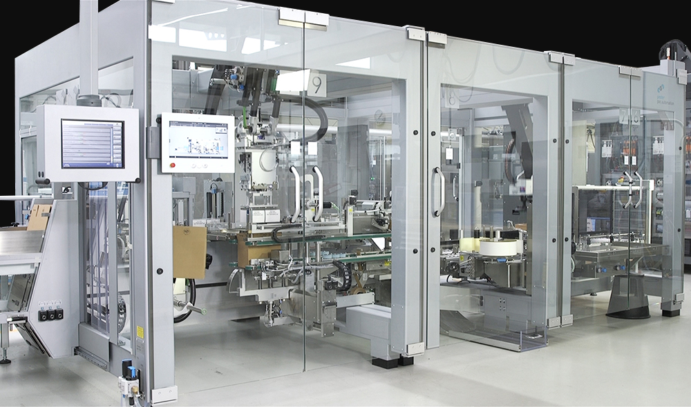 | High-precision case transport by means of 4 servo-controlled toothed belts with lugs |