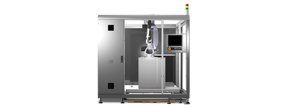 | Single-station palletizer with minimum space requirements and a high package density |
